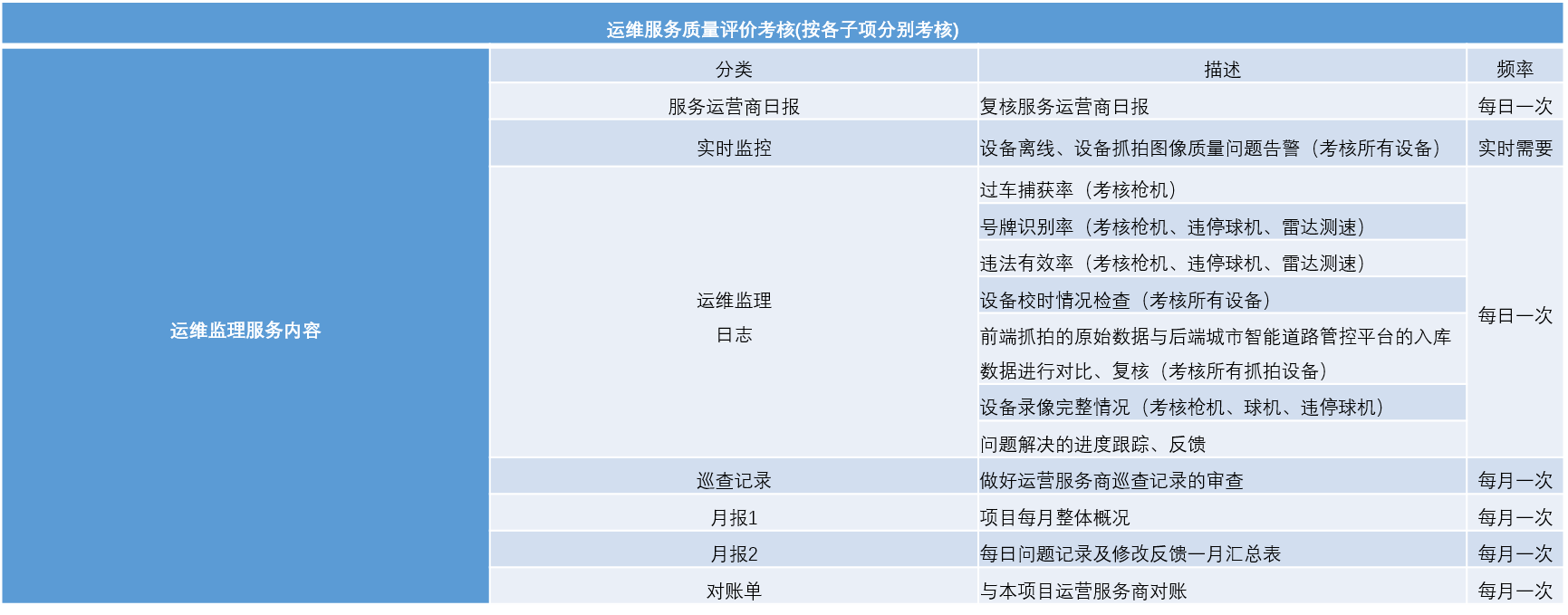 第三方运维监理服务,能够有效提升项目的建设质量、降低安全隐患,同时能在项目运营期间对系统的维护工作得到专业的有效监督,及时发现和反馈运营期间的各项问题,督促运营商及时处置与解决,切实提升运营商的运维服务质量,保障业务部门正常开展工作。在服务费用结算方面,台州市公安局交通警察局作为运营服务购买方,根据监理服务提供的每月评估和考核结果支付相应营运服务费用,避免服务发包方和服务承包方的争议,体现项目的公开、公平和公正原则。